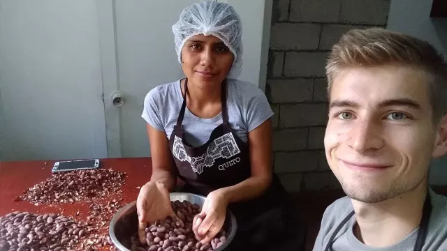 Laborchefin Ana zeigt mir das Selektieren von Kaffeebohnen, die im Anschluss zu hochwertiger Schokolade verarbeitet werden.