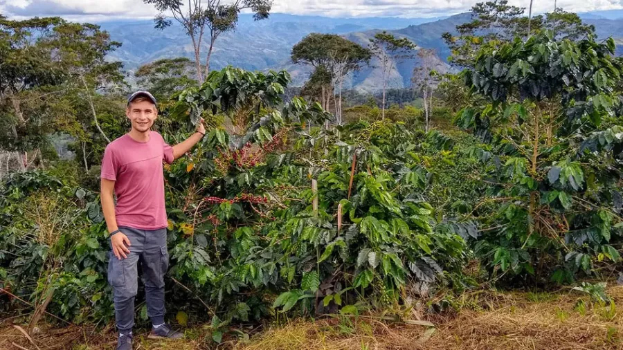Kaffeebauer Paco zeigt mir seine Kaffeefarm mit den ersten reifen Kaffeekirschen im Hochregenwald Perus.